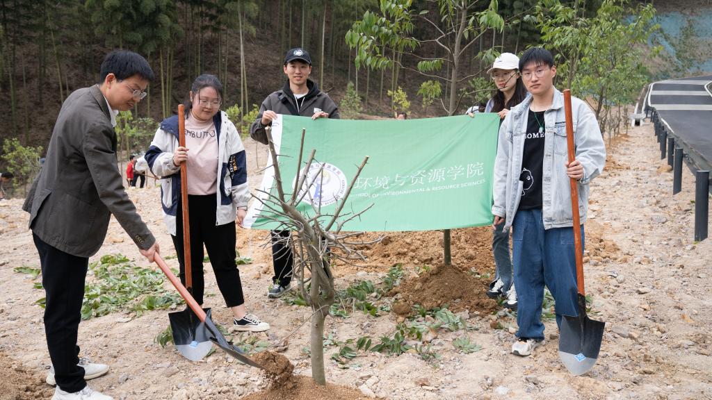 活动当天,以“共迎亚运零碳行,同建国际友谊林”为活动主题,环资院、碳中和学院相关负责人与国际学院相关负责人、以及学院师生等与半山村村民代表、百丈镇小学生代表共50余位中外友人共植“友谊树”,积极响应“碳中和”“碳达峰”政策,深度践行“四库理论”,共同牢筑中外友谊。据悉,“国际四库林”项目占地总面积近2000平方米,以前是林道施工现场的临时工程部。林道施工结束后启动造林方案。环资院、碳中和学院相关负责人了解到之后,与半山村商讨,以义务植树的形式种植浙江樟、山樱花、香榧、垂丝海棠等树种,发挥钱库、粮库、水库和碳库的多重功能。中国学生、本地村民以及来自美国、俄罗斯、澳大利亚、乌克兰等多个国家的留学生共同参与义务植树体验,共同构建人与自然生命共同体。留学生们学习了中国义务植树建设四库林的先进经验,吉尔吉斯斯坦留学生李民表示:“今天是我第一次参加植树,我觉得义务植树值得在我们国家推广,四库林讲明白了森林的作用,我要把在中国学到的先进技术带回国”。