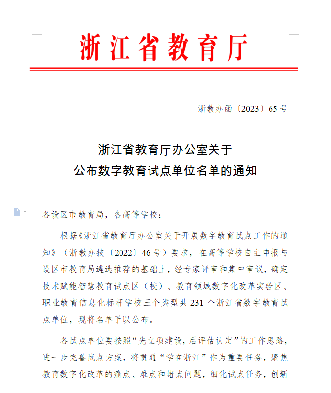 近日,浙江省教育厅发布了《浙江省教育厅办公室关于公布数字教育试点单位名单的通知》,BEAT365获批技术赋能智慧教育试点院校,同时入选的还有浙江大学等20所本科院校。