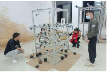 三位学子激动地表示,自省赛结束以后,所有闲暇时间都在实验室研究赛题,大家克服困难,团结合作,做过的模型堆满了实验室。即使手上粘满胶水,贴满创可贴,仍在坚持不断地改进方案,通过讨论、计算、实验终于使模型越来越轻,成功概率越来越高。最终,他们巧妙地采用了中国古建筑瑰宝之一的榫卯工艺,制作了满足严格尺寸要求的四柱八边形三层竹塔。该参赛模型以三重木塔结构为基本单元,模型自重138g,承受大于30多倍于模型自重的三级压、扭、弯,满载45kg。
