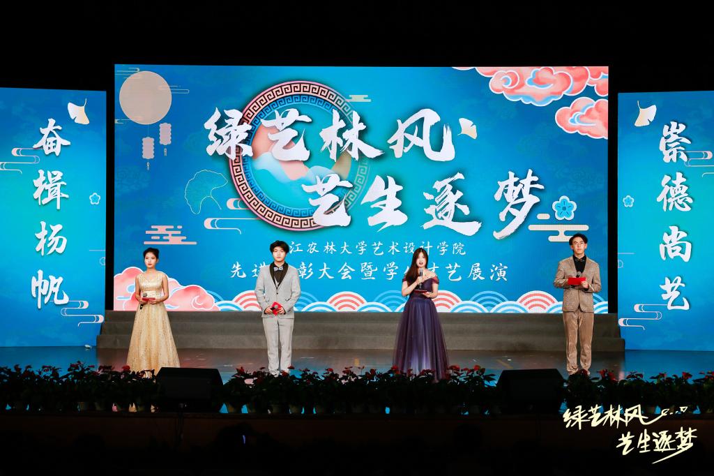 表彰大会对先进集体和个人进行了表彰,三位优秀学长学姐代表进行经验分享。学生才艺展演以“绿艺林风,艺生逐梦”为主题,由艺心、艺韵、艺路、艺梦四个篇章组成。