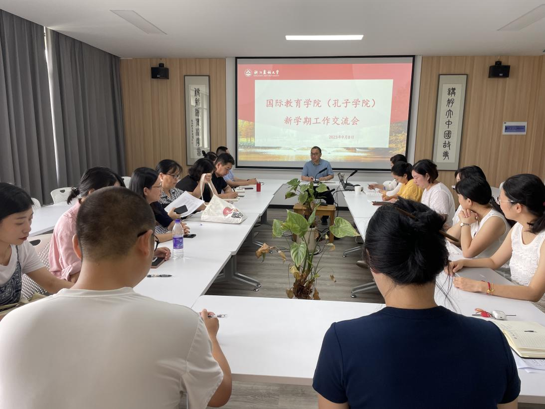 9月8日,国际教育学院(孔子学院)院长赵有华主持召开新学期工作部署会,全体教职工参加。会议传达了学校2023年暑期中层干部扩大会议和学习贯彻习近平新时代中国特色社会主义思想主题教育总结大会会议精神,部署了新学期各项重点工作。