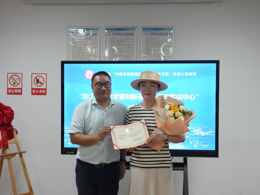 在全体嘉宾和学院师生的见证下,茶学与茶文化学院院长王磊与深圳市意利投资控股有限公司总经理孙琳代表双方共同揭牌“意利·骏荼家新茶饮实训中心”,并向孙琳和意利骏荼家的相关部门负责人颁发了校外实践导师聘书。