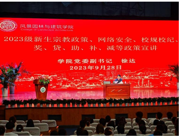 园林学院2023级新生安全教育讲座于活动中心影剧院顺利进行。园林学院学生工作负责人出席讲座进行主题宣讲,重点宣讲了宗教政策、网络安全、校规校纪、奖贷助补减等政策。本次讲座还特邀临安区锦北街道派出所沈一帆警官为新生普及安全知识。