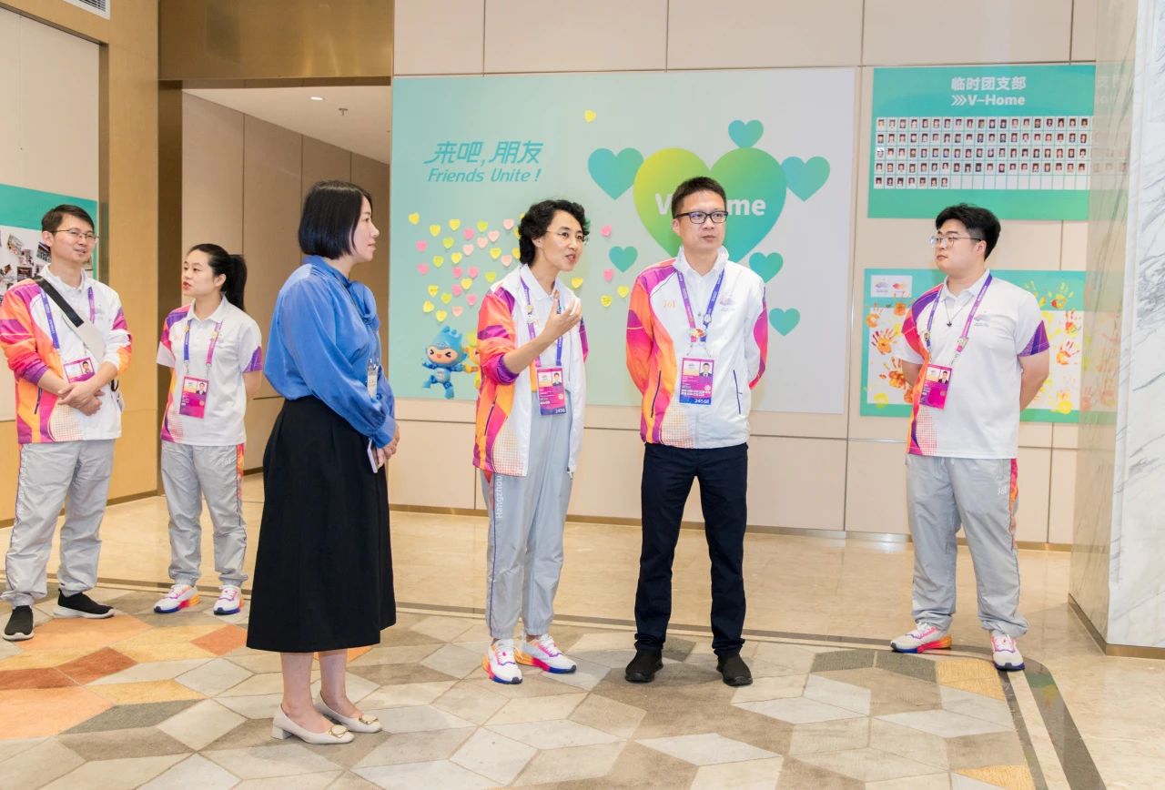 周妙荣与志愿者管理团队进行座谈交流。会上,周妙荣对志愿者团队的辛勤付出表示感谢。随后,周妙荣一行来到临安运动员接待饭店,走访了礼宾服务、交通引导、餐饮服务等业务领域,调研了志愿者换岗休整空间,看望慰问志愿者,了解关心志愿服务工作的基本情况和服务体验,赞扬了“小青荷”在赛事期间热情周到的服务,并提醒志愿者在岗期间一定要提高安全意识、保护好自身安全。