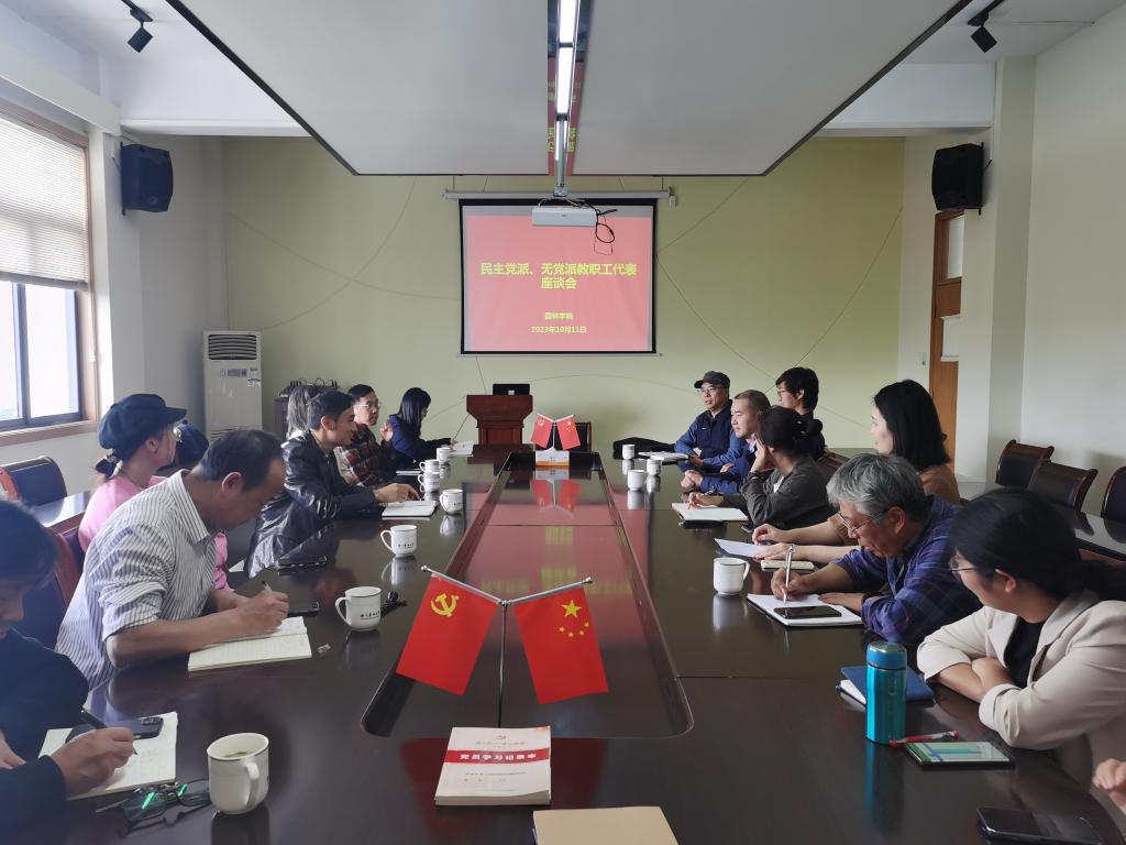 近日,园林学院党委召开了民主党派教师座谈会。学院党委书记陈审声,学院党委委员、工会主席方躬勇出席本次座谈会。民盟、民建、九三学社、农工民主党等民主党派教师以及部分群众教师代表参加了会议。会议由党委书记陈审声主持。