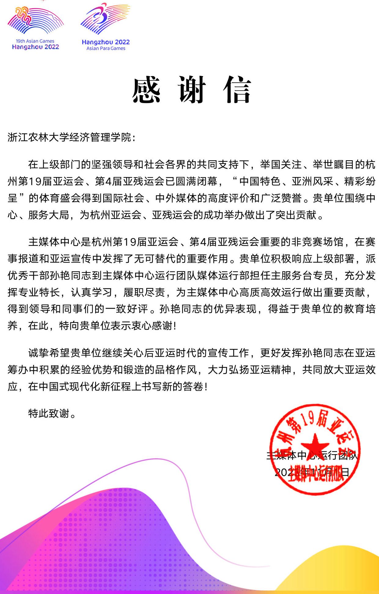 日前,杭州第19届亚运会主媒体中心运行团队给经管学院发来感谢信。信中高度肯定了经管学院孙艳老师、鲁晓玮老师亚运会期间在主媒体中心工作中克难攻坚、勇挑重担,为亚运会的圆满落幕做出的积极贡献表示了充分肯定,并对学校围绕中心、服务大局,为杭州亚运会、亚残运会的成功举办做出的突出贡献表达了诚挚谢意。