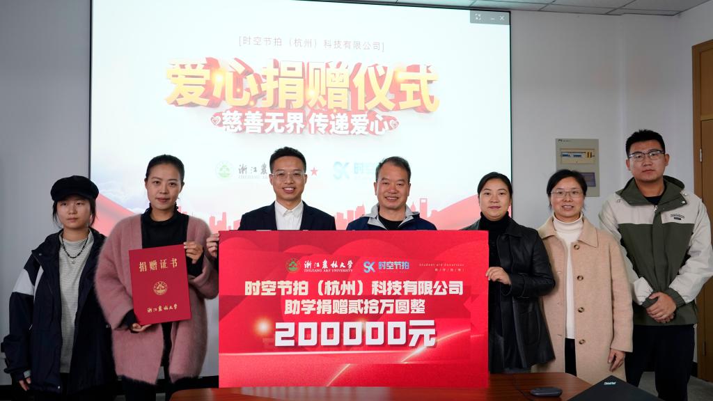 捐赠仪式上,学院领导向捐赠企业表示感谢,同时希望今后能与公司在数智教育、竞赛育人等方面进一步加强合作。捐赠方代表厉军表达了对母校的感恩之情,并希望公司和学院能在产学研、人才培养、实习实践等方面深度合作,为学生提供更多的实习实践机会和更好的平台。仪式最后,时空节拍(杭州)科技有限公司向学校捐赠20万元用于文法学院教育发展项目,学院党委书记朱红东为其颁发捐赠证书,并合影留念。