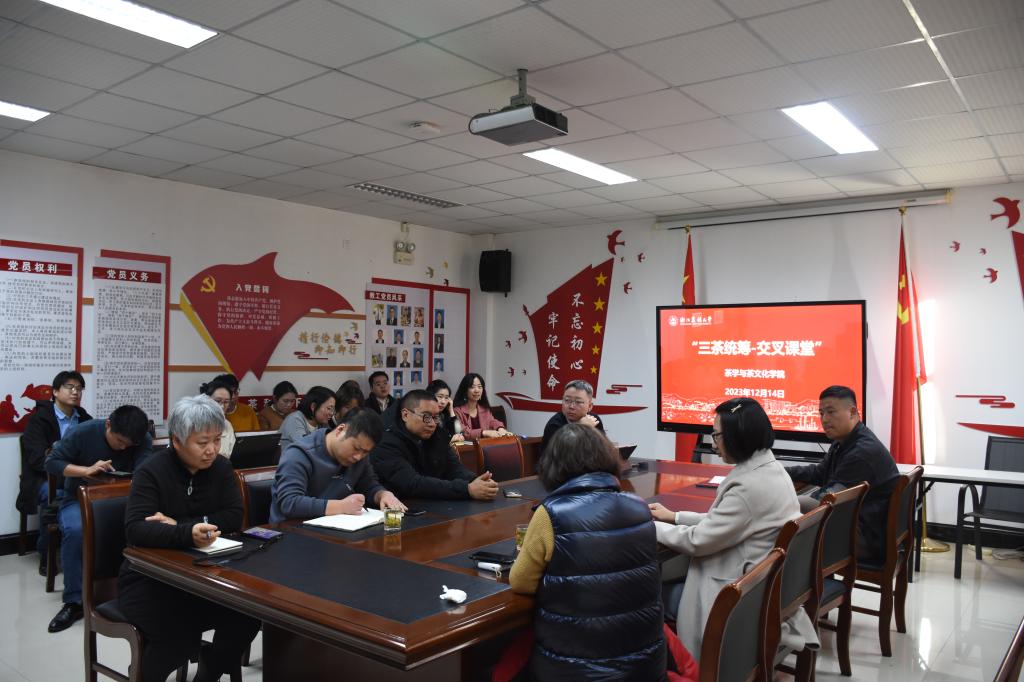 “三茶统筹·交叉课堂”第一讲,由茶学王玉春、茶文化张帅两位老师分别作“茶叶的由来”“文化遗产领域茶的交叉研究”主题交流分享。此次交叉课堂,主讲老师课前准备充分、课堂信息量大、背景数据详实,起到了较好的增进交流了解,促进交叉融合的效果。
