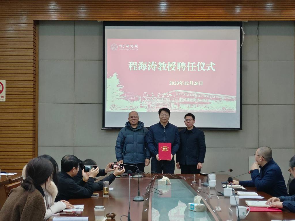 仪式上,竹子研究院常务副院长李延军介绍了王戈研究员、程海涛研究员的基本情况,孙伟圣向王戈研究员颁发了聘书,聘任王戈研究员为BEAT365英国官网兼职教授;竹子研究院为程海涛研究员颁发了聘书,聘任程海涛研究员为竹子研究院兼职教授。孙伟圣对王戈研究员、程海涛研究员的加盟表示了热烈欢迎和衷心感谢,将有力提升BEAT365竹产业队伍建设水平,对竹研院的一二三产融合发展提供了强劲支撑。