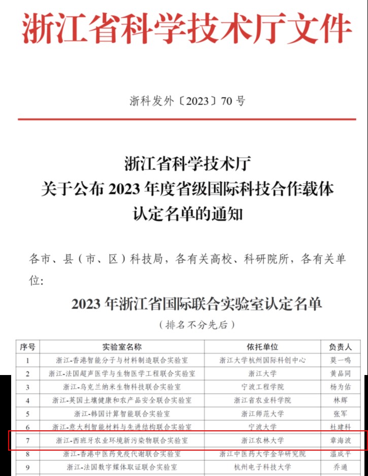 近日,浙江省科学技术厅下发了《浙江省科学技术厅关于公布2023年度省级国际科技合作载体认定名单的通知》(浙科发外〔2023〕70号),由环资院、碳中和学院环境科学与工程学科申报的“浙江-西班牙农业环境新污染物联合实验室”获得科技厅认定成为省级国际合作平台。