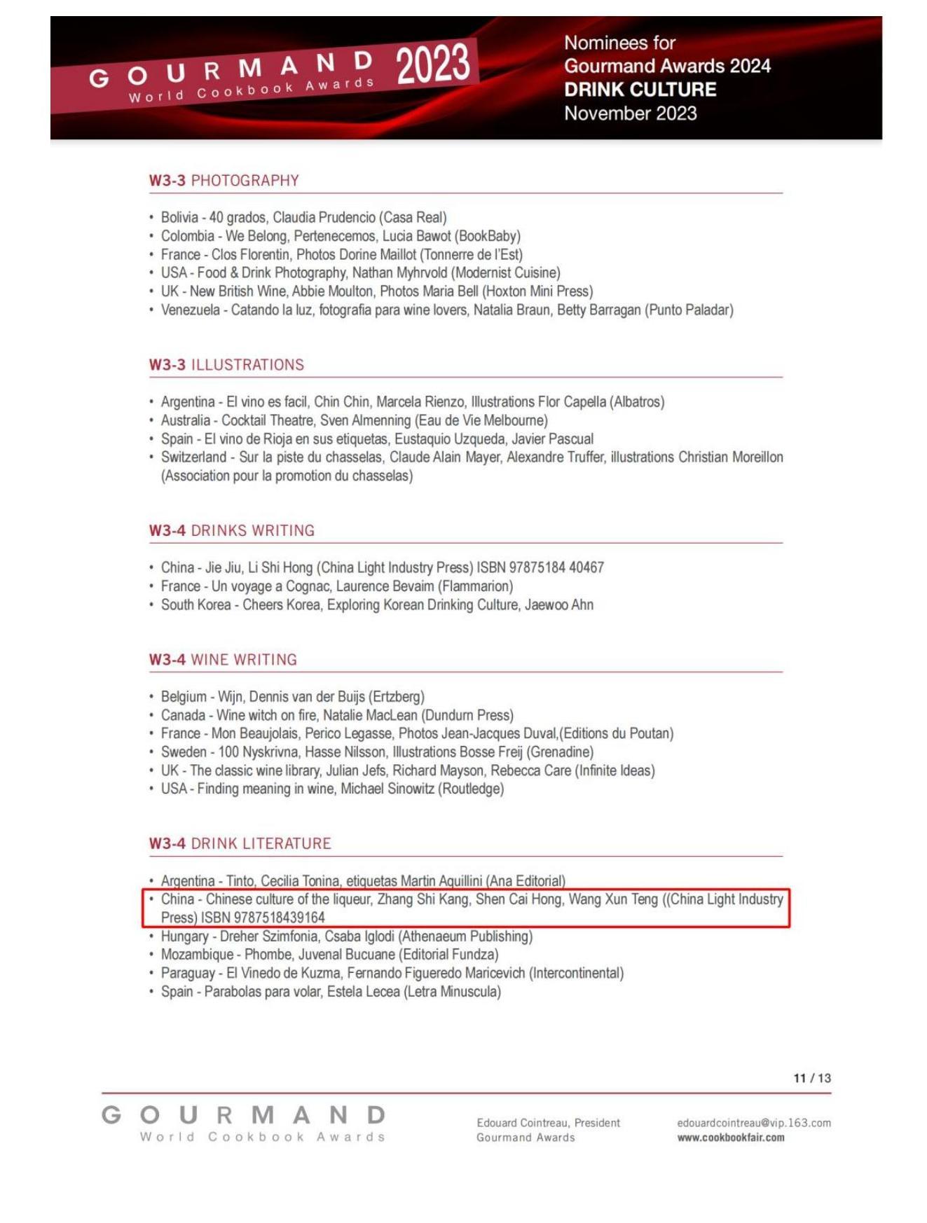 据悉,世界美食美酒图书大奖由法国君度世家继承人爱德华·君度(Edouard Cointreau)于1995年创立,是全球最权威的美食美酒图书奖项,被誉为国际美食美酒“奥斯卡奖”。每年,该奖项会对全球205个国家出版的十几万种饮食类图书进行市场采集、整理和比较,评选出最佳美食和美酒图书奖项。