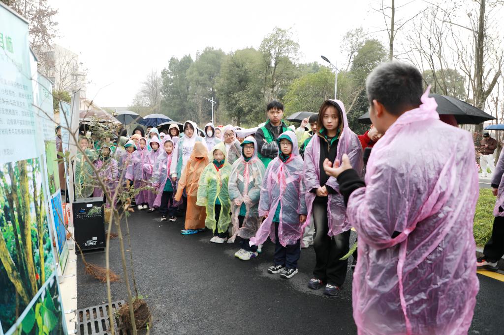 植树现场,农林大学雷锋班的大学生和衣锦小学“钱学森”班的小学生1对1结队,学生志愿者们在学科老师的指导下纷纷撸起袖子挥锄、挖坑、培土、浇水......团结协作,相互配合,一起种下一株株夏蜡梅、普陀鹅耳枥、舟山新木姜子、赤皮青冈、玉兰叶石楠等重点保护野生植物。种植结束后,同学们纷纷在标有树种介绍的标签上进行记名认养,以便后期进行定期养护,虽然天空下着濛濛细雨,但这场别开生面的生态实践课让同学们的激动兴奋之情溢于言表。