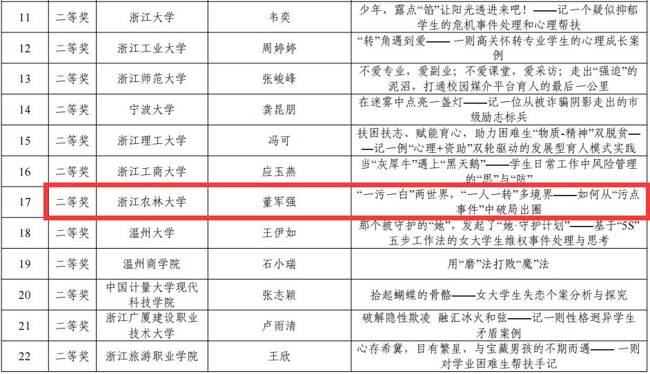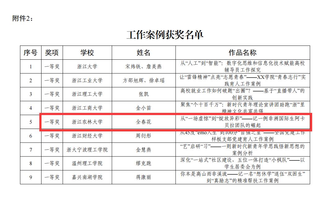 国教学院全春花的作品《从“一场虚惊”到“绽放异彩”——记一例非洲国际生阿卡贝拉团队的崛起》获得工作案例一等奖,环资学院董军强的作品《“一污一白”两世界,“一人一转”多境界——如何从“污点事件”中破局出圈》获得个人案例二等奖。