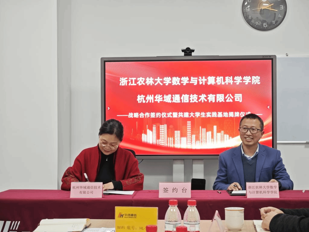 近日,数计学院与杭州华域通信技术有限公司在青山湖科技园举行了战略合作协议签约仪式暨大学生实习实践基地揭牌仪式。数计学院党委书记冯金明及相关负责人,华域通信技术有限公司董事长钱静,以及双方相关部门、专业负责人出席仪式。