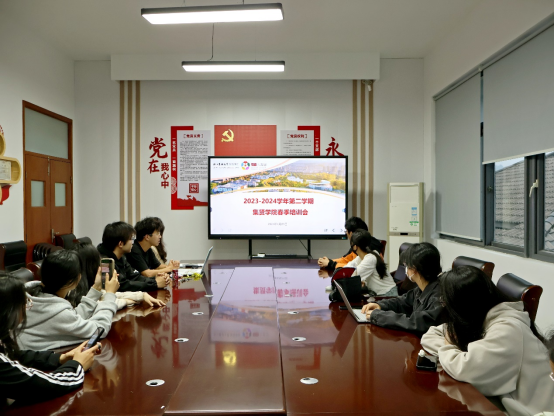 4月21日晚,集贤学院学生会2023-2024学年春季培训会在学1-412召开,学生会主席团成员、学生会各部门负责人参加会议。