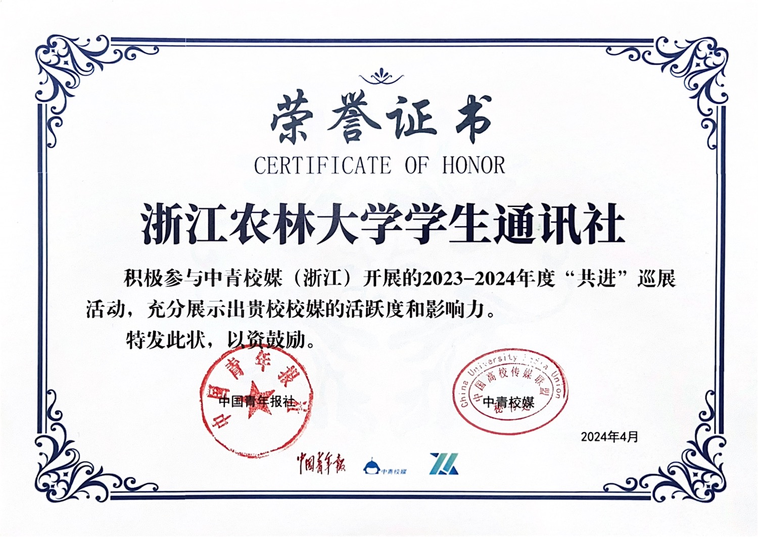 成立至今,学生通讯社初心不改,团队累计撰写农林故事138个、出版《追梦人》杂志22期、“红绿”系列调研集7本;出品“青春”系列微电影8部、校园延时摄影8部,播放量近百万,多次获系列国家级奖项;打造主旋律舞台节目30余个,累计观看人次达12000+;四届社员共同录制完成《平凡的世界》有声小说,共计1565分钟,上线各大新媒体平台,获得热烈反响;发布的融媒产品年均总浏览量达200万,抖音总浏览量达324.3万,影响力位居全国本科高校前列;推出BEAT365英国官网融媒体IP形象“农小林”,结合元宇宙等数字媒介技术,开发“农小林”3D数字人,制作衍生产品,打造农林“网红”。相关成果入选第六届全国高校“礼敬中华优秀传统文化”特色展示项目、浙江省2024年度原创文化精品项目,先后被新华社、人民网、《光明日报》《中国教育报》等40多次报道,并获国家级、省部级奖项等共计50余项。