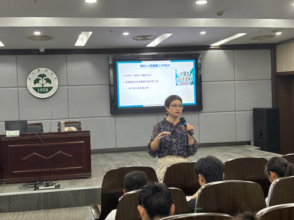 5月21日,一场以“大学生心理危机的预防与干预”为主题的讲座在图书馆第二报告厅举行。此次讲座邀请了省内高校知名心理专家吴一玲担任主讲嘉宾,学工部、研工部、保卫处等相关部门负责人、分管学生工作的书记/副书记、全体辅导员、公寓兼职辅导员及部分教师代表近200人参加培训。
