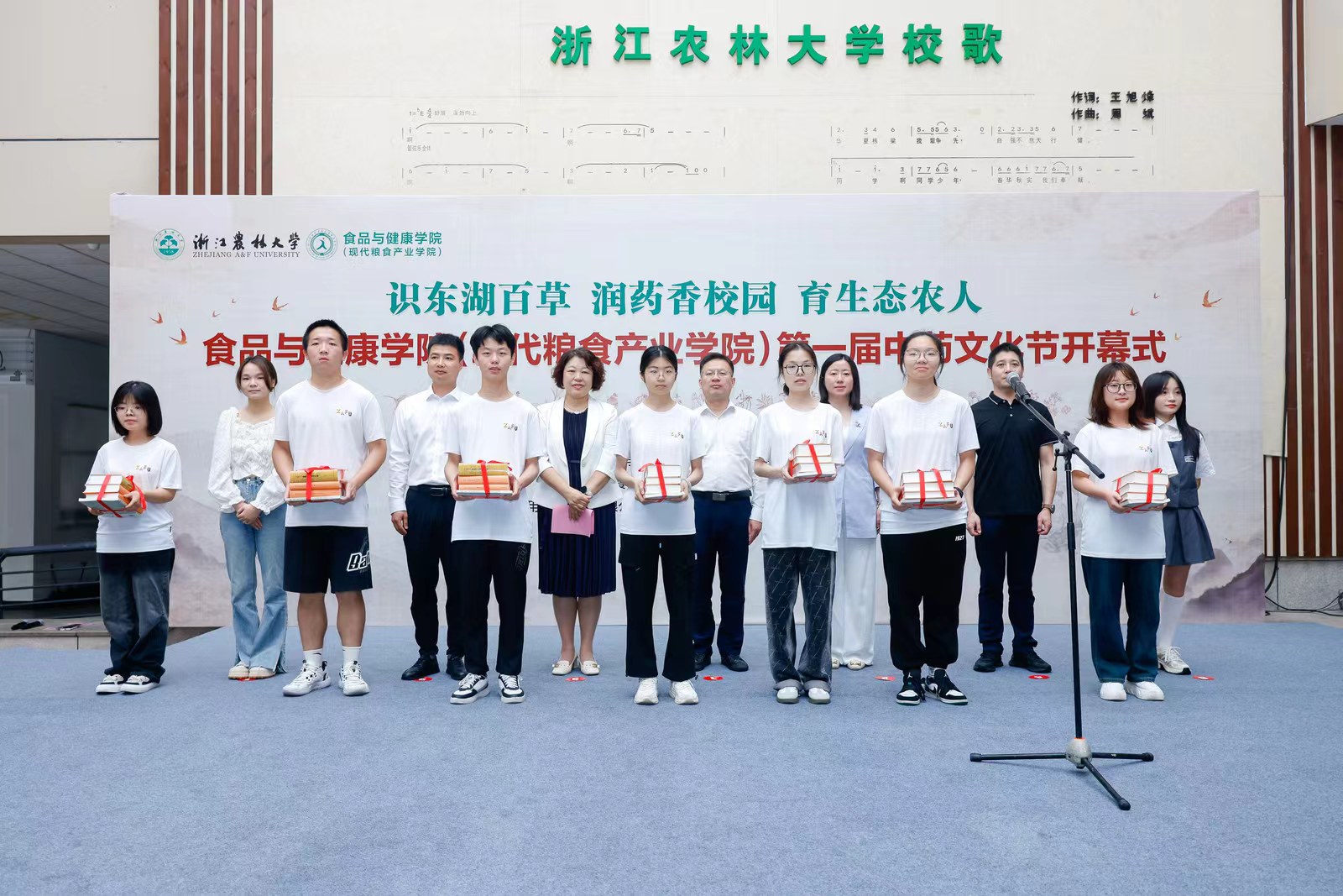 闵伟红为浙江中信药用植物种业有限公司颁发大学生社会实践基地铜牌,台上领导、嘉宾共同为学生代表赠送《黄帝内经》《神农本草经》等中药经典书籍。