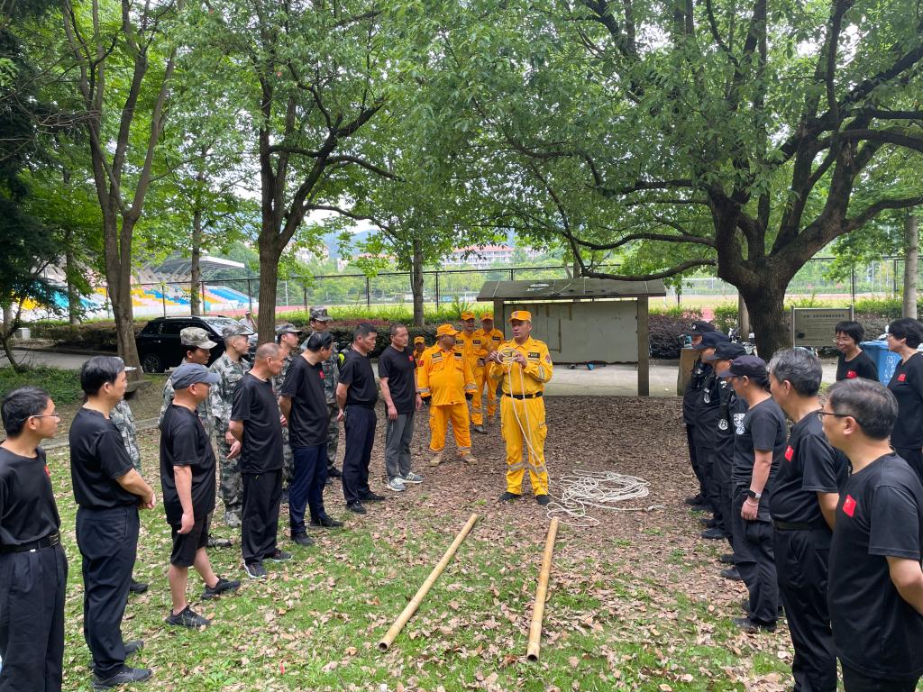 在简短的队列操练后,参训人员进行了野外救援打绳结、制作担架培训,并模拟了野外救人和运送伤员。随后开展的体能素质拓展训练中,参训人员进行了速降学习和实践,掌握了绳子、滑索等基本的速降装备使用方法,体验了速降的手脚配合和注意事项等。