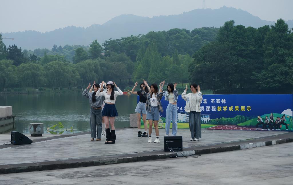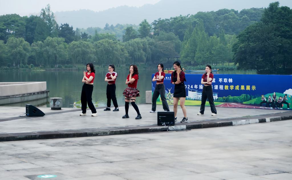 由体军部鲁春娟、赵倩、顾静霞三位老师指导的,参加操舞类选项课的2022级学生组成近60支参演队伍,依次进行了汇报表演。在音乐的律动中,他们的动作整齐有力,刚柔并济,精准到位,体现了力与美、柔韧与刚毅的完美契合,展示了浙农林大学子的青春活力。各队伍更是在表演过程中将自编的舞蹈动作与传统的操舞动作完美融合,精彩的表演一次次将活动推向了高潮。