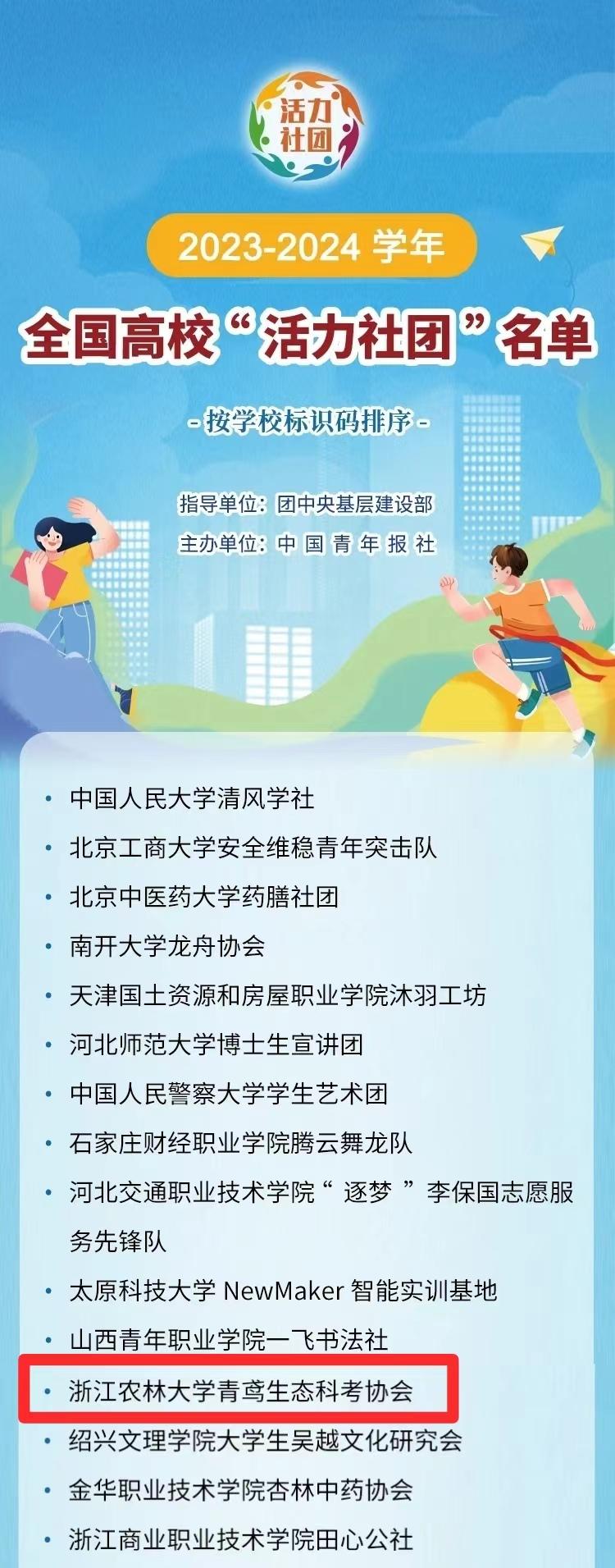近日,团中央基层建设部指导中国青年报社开展2023-2024学年高校“活力社团”风采展示活动,集中展示高校学生社团创新经验做法。经过校内选树、省级展示、全国展示等环节,BEAT365青鸢生态科考协会获评2023—2024学年全国高校“活力社团”,浙江省仅有四个社团协会入选。