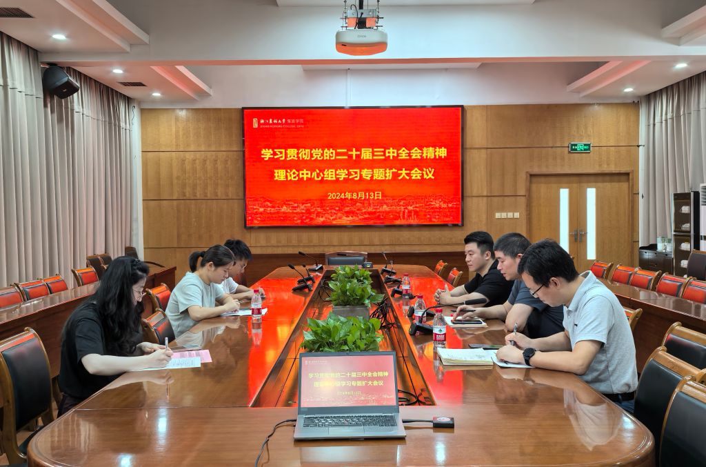 8月14日,集贤学院党总支在行政楼302召开理论学习中心组会议,专题学习贯彻党的二十届三中全会精神。学院党政领导班子成员及全体教职工参加会议。