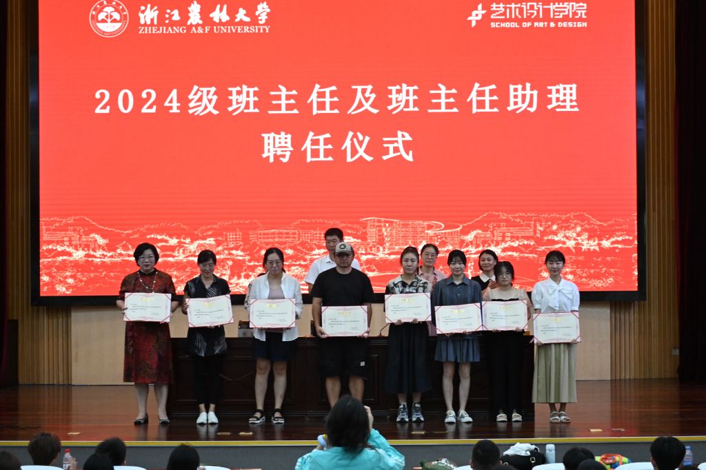 艺术学院党委书记黄晓芳宣读2024级班主任及班主任助理名单,学院领导为班主任代表颁发聘书。学院院长陈思宇以“设计未来”为题,为2024级新生讲授开学第一课。他从学院概况、人才培养、专业介绍、未来规划四大方面分析当前艺术与设计领域面对的机遇与挑战,鼓励同学们要多学、多记,多看、多想,团结、互助,朝着“把自己变成设计师、把自己变为人才”的方向而努力。