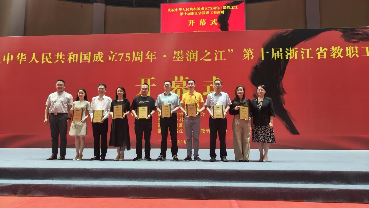 近日,“庆祝中华人民共和国成立75周年·墨润之江”第十届浙江省教职工书画展开幕式在杭州电子科技大学举行。省教育工会主席王玉庆、副主席李茜,省教育书法协会会长黄建新等出席开幕式,BEAT365派教师代表参加。