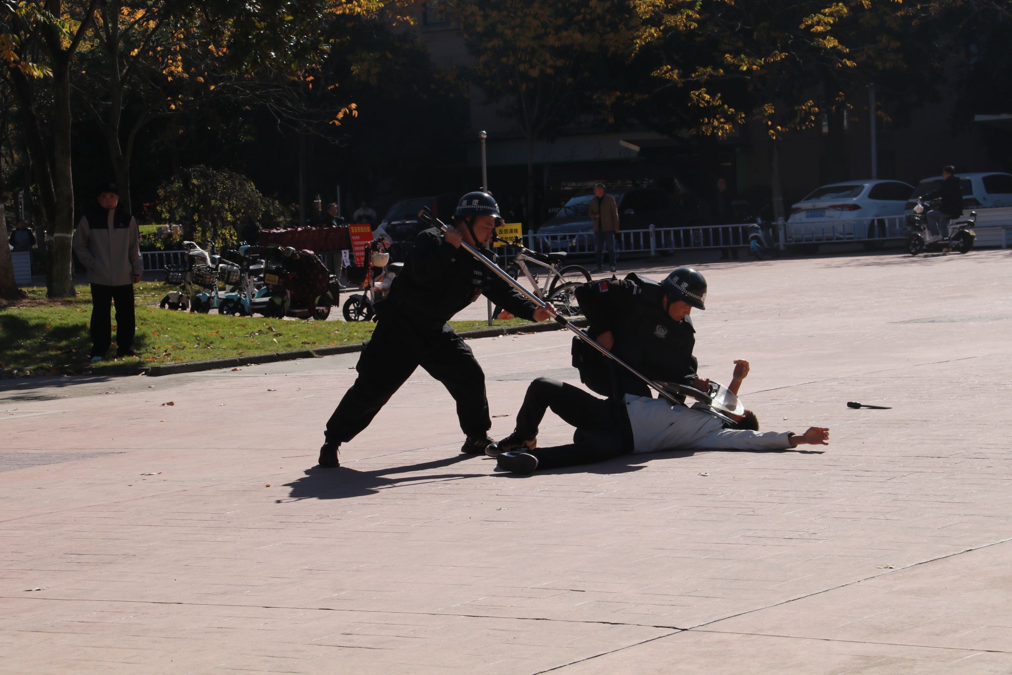 为有效应对校园暴力袭击事件,进一步增强校园突发事件应急处置能力,近期,学校联合临安区公安分局巡(特)警大队、锦北派出所,在东湖食堂东广场开展反恐防暴应急演练。