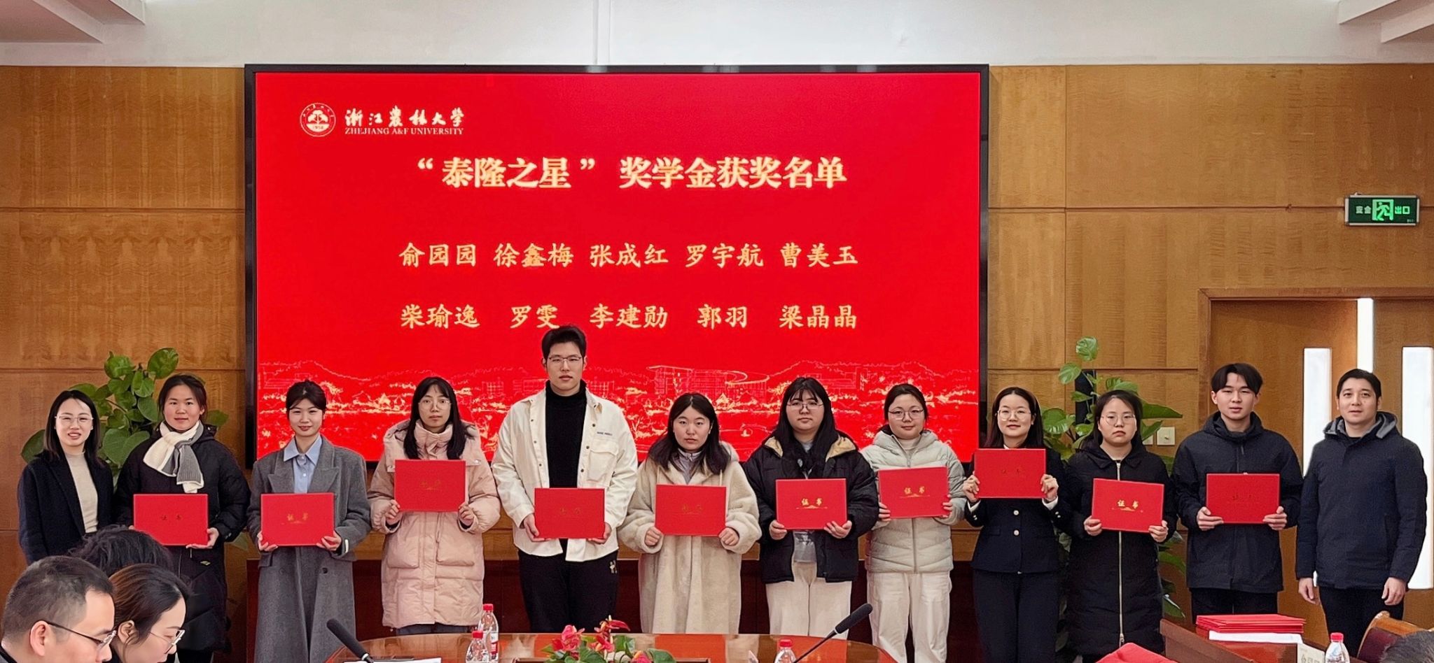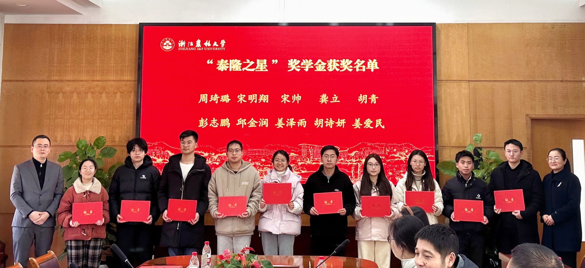 双方领导为“泰隆之星”奖学金获奖同学颁发了荣誉证书并与获奖同学合影留念。