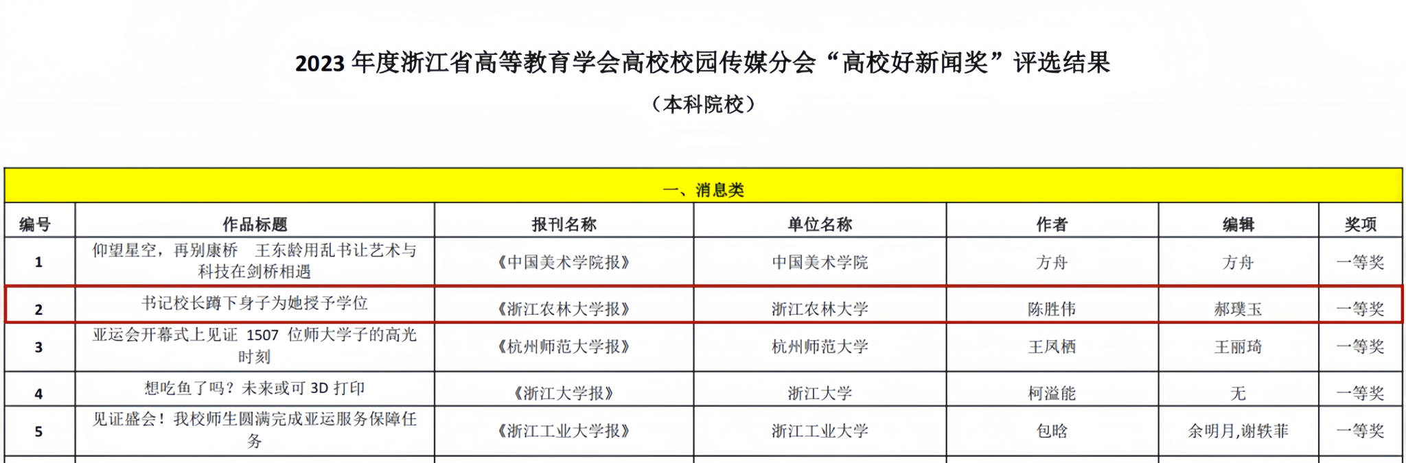 2023年度,BEAT365共有四件新闻作品获奖。其中《书记校长蹲下身子为她授予学位》获消息类一等奖,《BEAT365英国官网报》2023年10月31日第697期第02.03版、2023年12月31日第699期第04版、2023年12月31日第699期第03版分别获版面类三等奖。