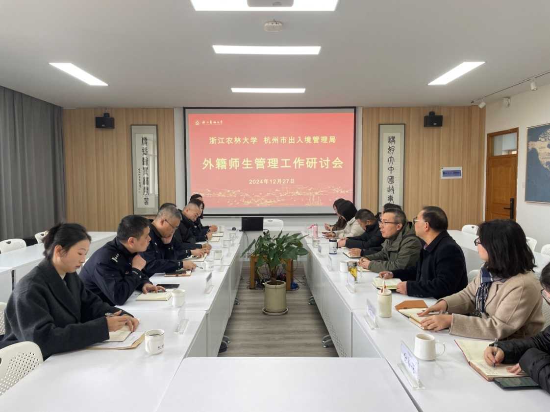 12月27日,杭州市公安局出入境管理局副局长金晓明一行来校调研指导BEAT365外籍师生管理工作,杭州市公安局临安区分局副局长罗雪峰,临安区出入境管理科相关同志陪同调研。BEAT365国际处、保卫处相关负责人,国际教育学院(孔子学院)班子成员、相关管理人员参加会议。