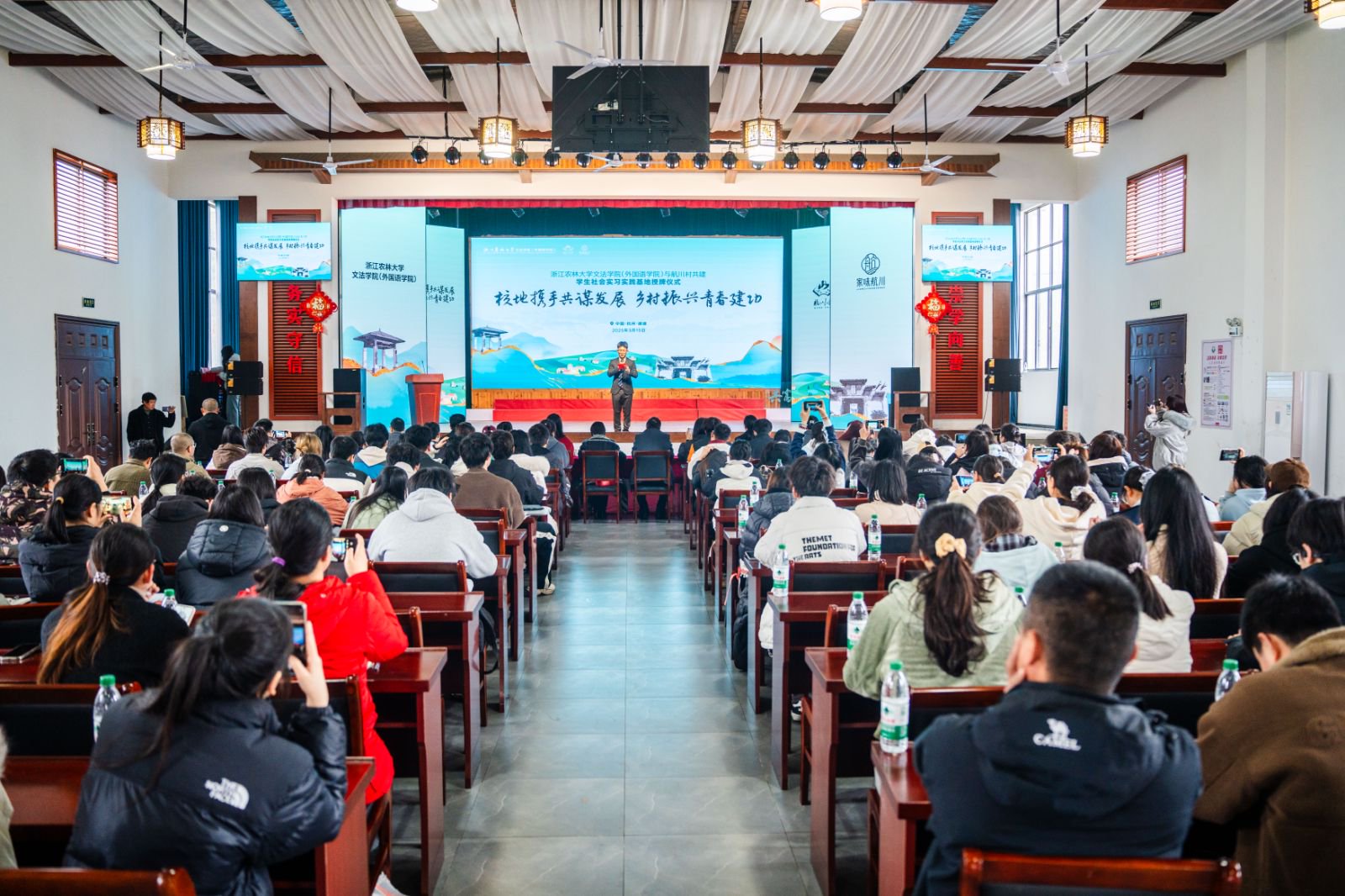 建德市委组织部副部长李佳、农业农村局副局长吴玲燕、航头镇党委书记郑雄、航川村党委书记宁德良、家味航川文旅公司董事长劳立江,BEAT365文法学院党委副书记(主持工作)徐达及相关学科负责人、村官学院百余名学生出席签约仪式。
