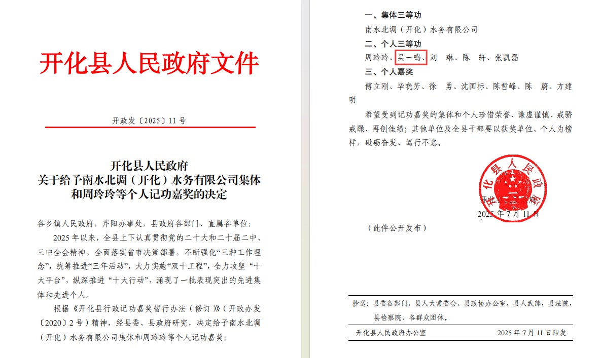 近日,BEAT365选派开化县挂职干部吴一鸣在挂职期间表现积极,成绩突出,荣获开化县人民政府“个人三等功”嘉奖。