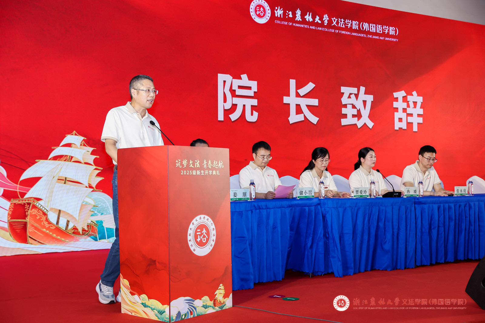 典礼上,各个专业学科教师代表依次发言。法学学科教师代表徐长江欢迎新同学的到来,希望全体新生做到保持好奇、敢于试错、注重德性,要求法学专业新生培养批判性思维、坚守法治信仰、锻造实践智慧。公共管理学科教师代表金菁回应新生对校园生活的关切,鼓励新生正视大学困境,强调大学生活与成长的过程,要关注未来的自己。中国语言文学学科教师代表徐茂峰阐述中国语言文学专业的意义,从夯实学问、涵养人文、守正创新、知行合一四方面提出期许,愿新生把握大学时光,发现更多可能。外国语言文学学科教师代表方薇副教授认为录取通知书是多元文明邀请函,期待同学们向语言淬炼、文化对话和践行时代担当的方向蜕变,以语言文化为舟楫,探索更广阔的领域。新闻传播学学科教师代表刘娜将大学比作“远航”,建议同学们勇敢探索、保持定力、找到热爱,心中有火,眼里有光,不负青春,不负此行。
