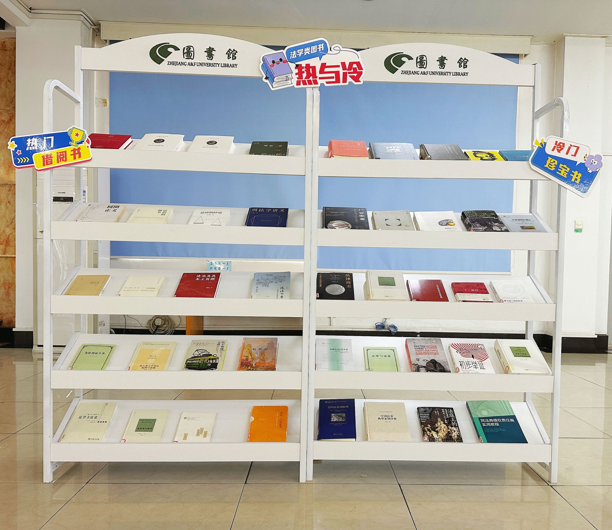 近日,法学类主题图书展在衣锦图书馆二楼大厅展出。本次展出的图书中既有法学类热门借阅的图书,也有小众法学学术书籍。