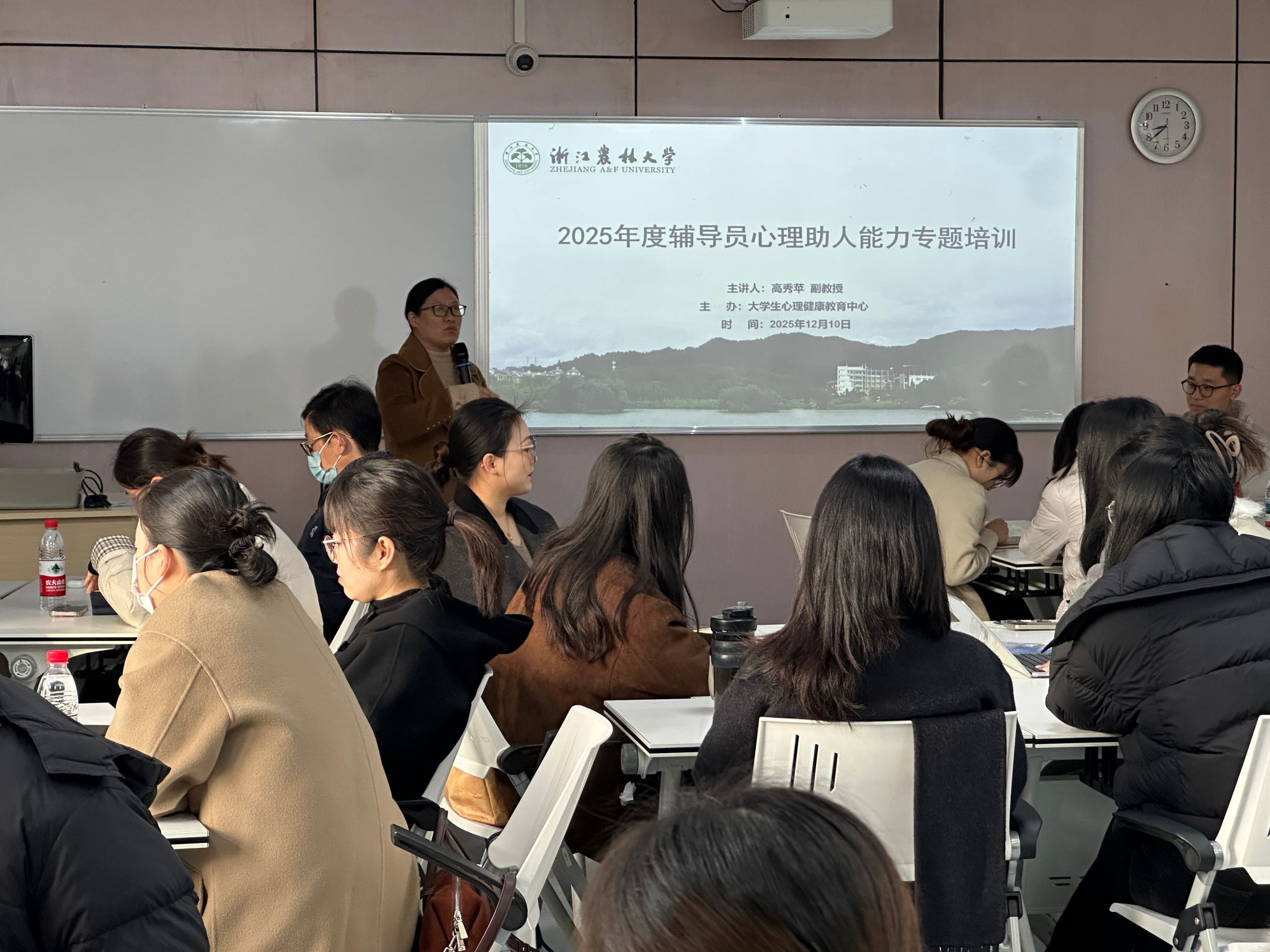 12月10日,学工部心理健康教育中心在教1407举办辅导员心理助人能力的专题培训。本次培训由浙江树人学院心理中心主任高秀苹副教授主讲,各学院新晋辅导员、公寓辅导员等共49人参与,共同围绕学生心理问题的识别、评估与干预展开深度学习与交流。
