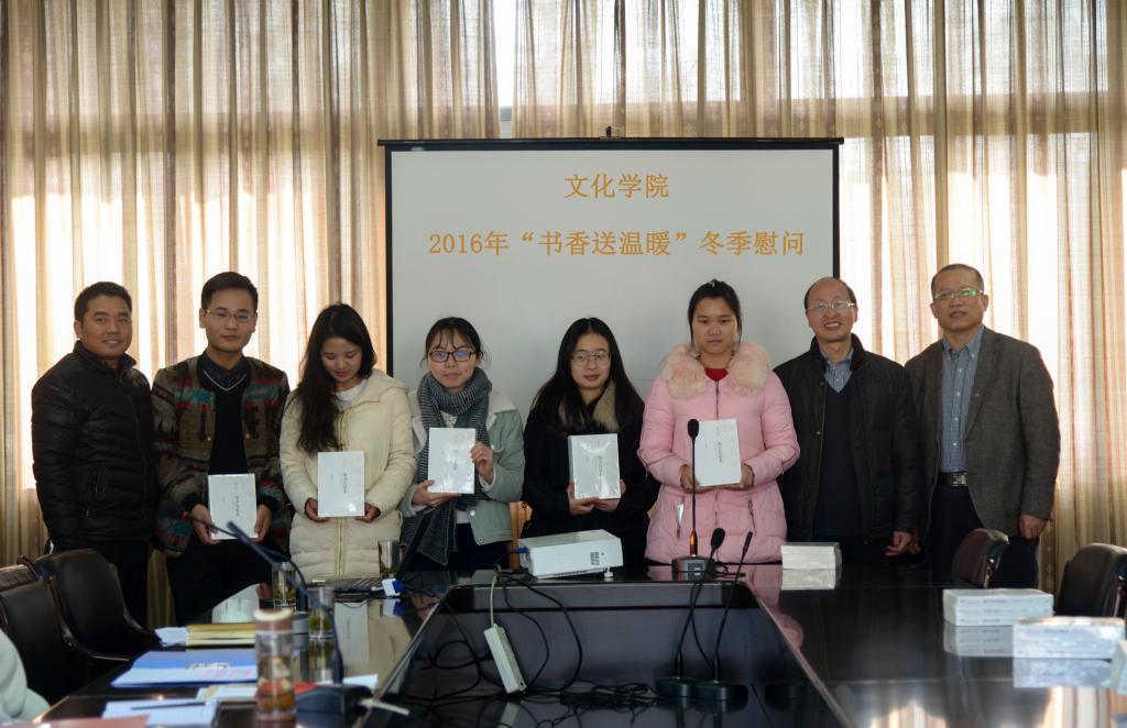 书香暖冬,以文化人,文化学院一年一度的冬季送温暖如约而至。12月15日午后暖阳里,学院党委书记王亚伟老师及学生工作负责人为远道而来的藏族学生、2016级经济困难生、学院勤工助学学生代表送上特别的冬季慰问品——茅盾文学奖得主、文化学院院长王旭烽教授的著作《茶人三部曲》。