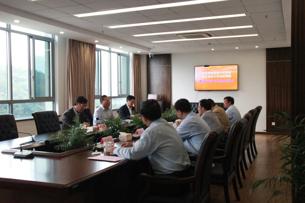 王长金一行向遂昌县人民法院陈有南院长颁发兼职教授聘书,并与遂昌县人民法院负责人签订教学科研基地共建协议并授牌,还就教学科研基地的背景、成立过程、基地功能和愿景等方面进行相关介绍。