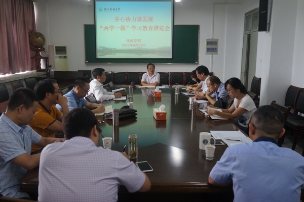 为深入谋划学院科学发展,推进“两学一做”第三专题的学习教育,9月22日下午,法政学院在实验大楼612召开会议学院发展务虚会及“两学一做”学习教育推进会,院长、党总支书记王长金主持会议,学院相关负责人、各教工党支部书记、各学科教学科研团队岗成员十余人参加会议。
