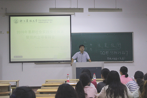 6月26日晚,农业与食品科学学院、动物科技学院(筹)在教5-301召开2016年大学生暑期社会实践安全教育暨院内团队立项答辩会。学院学生工作负责人、辅导员、2016年各社会实践团队负责人、新闻联络人及团队骨干参加了活动。