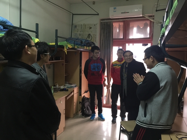 12月14日下午,信息学院院长寿国忠走访了学院2014级部分学生寝室,了解同学们的学习生活情况,指导文明寝室建设工作。