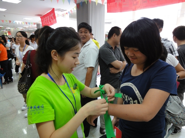 浙农林大新闻网讯 “同学,你好,这个绿丝带是我们环资学院倡导绿色低碳的象征,请让我为你佩戴。”在新生报到现场,环资学院同学们为每位2011级新生系上寓意“绿色、低碳、生态”的绿丝带,旨在树立新生们的生态理念、低碳意识,给新生们上好生态教育第一课。