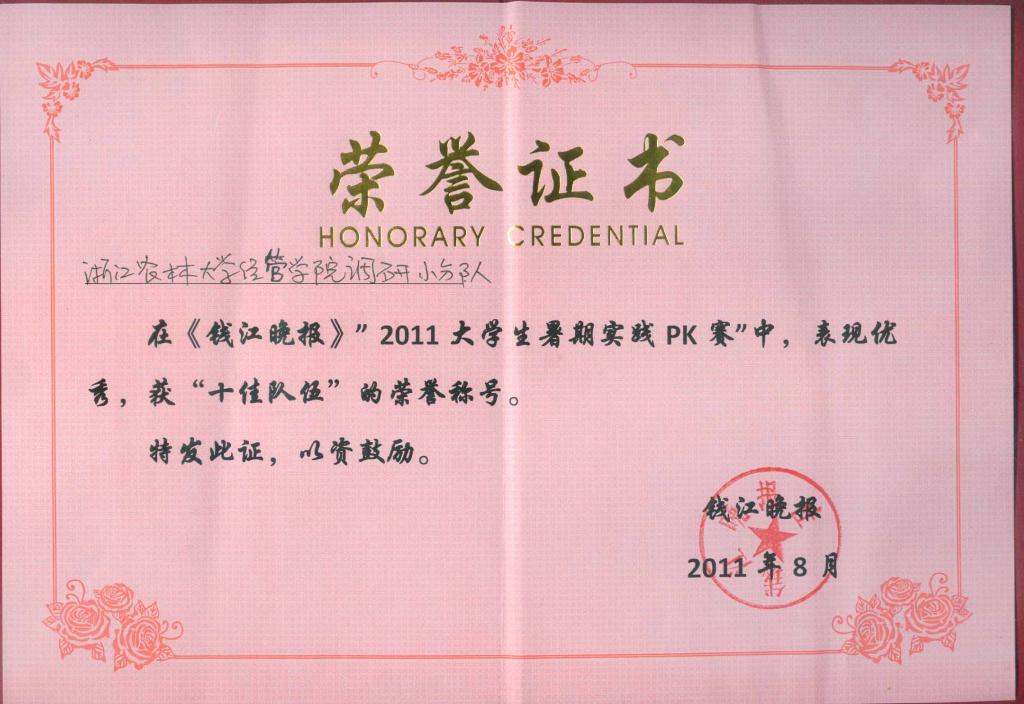 8月29日,由浙江日报社主办,《钱江晚报》承办的浙江省高校2011年大学生暑期社会实践PK赛在浙江日报社举行,由BEAT365选派的经济管理学院“情牵三农发展,共创生态经济”调研团队喜获浙江省高校暑期大学生社会实践“十佳队伍”荣誉称号。