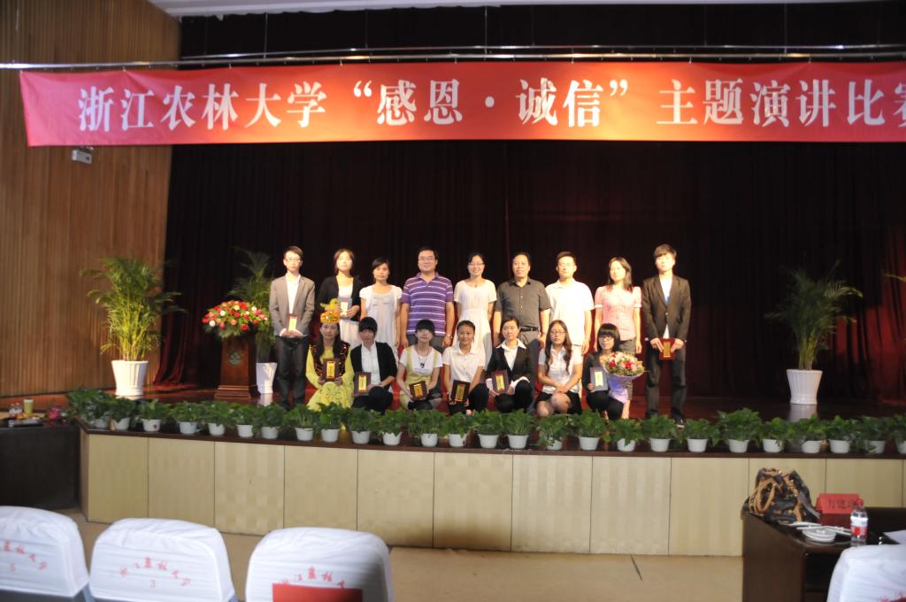本次比赛以“感恩·诚信”为主题,共有27名学生报名参赛,经过激烈的预赛,共有10名选手入围决赛。比赛中,选手们精彩的演讲和赋予张力的表现给在场的每一位观众带来了一场听觉的盛宴。1号选手巴永超,她用优美的声线将自己与母亲相处的点点滴滴娓娓道来,内容贴近生活,与评委及听众产生共鸣;6号选手王志斌用男生的刚毅与坚定诠释了他心中的感恩与诚信;来自新疆的9号选手地娜·木拉提,身着民族服装,以《是您——我亲爱的祖国》为题,将自己对祖国与学校的感恩之情溢于言表;10号选手唐晓芳更是用她声情并茂的演讲,博得台下观众的阵阵掌声。经过激烈的角逐,来自法政学院的王志斌同学获得一等奖;来自林业与生物技术学院的地娜·木拉提和外国语学院的曹瑞红分别获二等奖;来自经济管理学院的徐维扬等获三等奖。