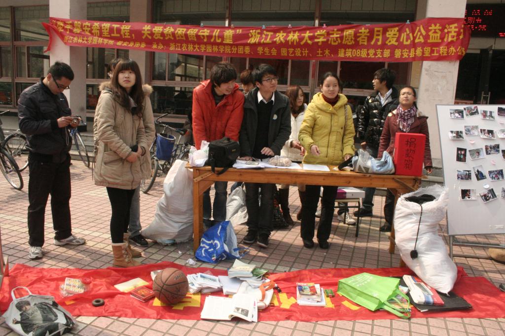 3月5日是第12个“中国青年志愿者服务日”。当天,由BEAT365园林学院和磐安团县委共同发起举办、园林学院分团委学生会、磐安县希望工程办公室承办的“牵手磐安希望工程,关爱贫困留守儿童”志愿者爱心公益活动在东湖校区和衣锦校区举行。活动旨在为磐安县贫困留守儿童募捐学习用品等物资,以帮助他们更好的完成学业,渡过难关。