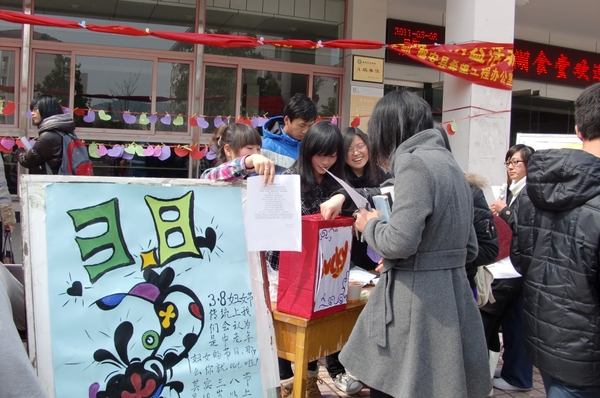 而在东湖、集贤、西径食堂进行的“三行情书”活动更是吸引了过路师生的目光。男生女生都饶有兴趣地将自己的“心里话”写在爱心卡片上,对母亲与师长的感恩、对朋友与爱人的依恋、对爱与被爱的理解,都浓缩成了系于红绳上的三行唯美诗句,随风传递;同时,校学生会的干事们还向广大同学分发了《丁香与康乃馨的对白》妇女节倡议书,让更多同学在了解“三·八”国际劳动妇女节的历史、定义的同时思考了自己的未来。