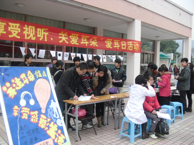为进一步普及耳朵健康知识,在3月3日第十二个全国“爱耳日”里,工程学院分团委、旅游与健康学院分团委和大学生健康促进协会携手临安市人民医院在东湖食堂前联合开展了以“关注耳朵健康,享受多彩生活”为主题的爱耳活动。