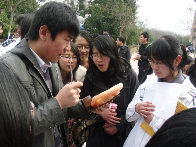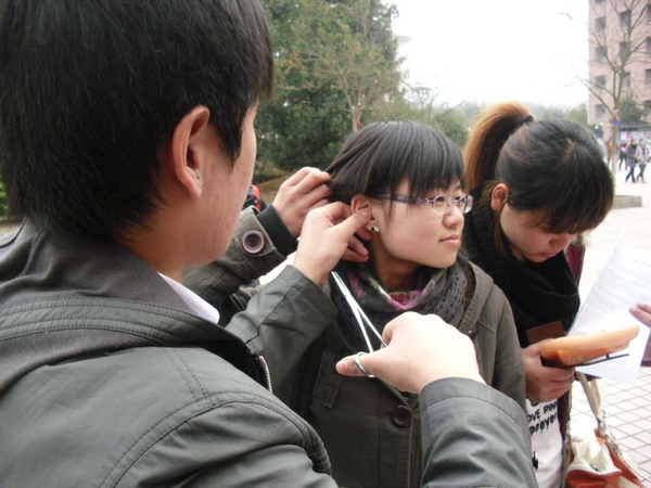 活动包括了耳部常规检查、耳部按摩手法教学、耳部疾病预防知识普及、耳部穴位指导等方面。“这是一个耳部模型,耳朵上连有身体上的各个穴位,比如说,耳垂上有连着眼部的穴位……”临安市人民医院耳鼻喉科医生唐江凤现场拿着耳朵模型耐心的为询问者讲解有关耳部知识,还为部分有需要的同学进行现场常规检查并提出治疗建议。工作人员还将适用于中医耳穴刺激治疗的王不留行子耳贴为同学贴上,大学生健康促进协会成员也为同学进行耳部按摩。活动现场共有200余位同学得到现场服务,发放了300余份宣传单。
