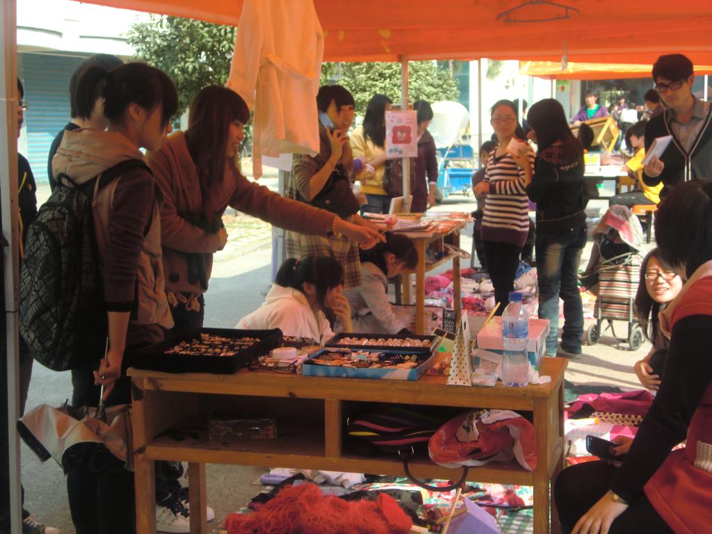 在联建公寓淘宝市场内,交易的商品从专业书籍到休闲杂志、从衣服鞋帽到挂件发卡,琳琅满目、种类繁多,吸引了不少学生前来观看并购买。经营者热情地向过往人群作商品介绍,学生顾客精心挑选自己中意的物件,整个市场热闹非凡。
